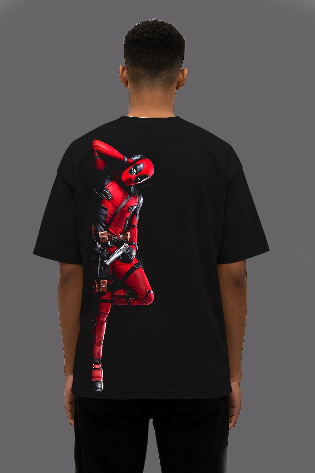 Fun, fearless, and full of attitude—this Deadpool dual-design T-shirt brings his playful side to life. The front features Deadpool’s animated body pose, while the back shows him casually lying down, relaxed and unbothered. Perfect for fans who love humor with hero energy, this tee keeps your style cool, bold, and unpredictable—just like Deadpool himself.